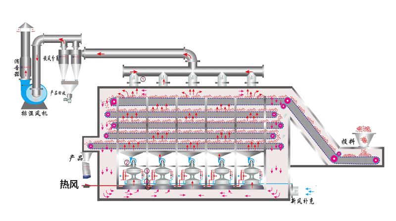 廣泛應用於(yú)冶(yě)金助劑、化工(gōng)、食品、包裝等領域。多層帶式幹燥機已具備(bèi)滿足大生產、多元化、集中(zhōng)控製、連續生產的能力(lì)。具有(yǒu)高效、節能、易於管理的優勢。如:脫水蔬菜、顆粒飼料、味精、椰蓉;有機顏料、合成橡膠、丙稀纖維、藥品、藥材、木製品;塑料製品、電子元器件老化、固化、冶金助劑、化(huà)工、食品、包裝等。